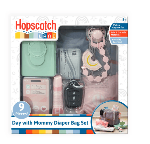 Let your little one care for their baby doll just like a real parent with the Hopscotch Lane My Baby Doll's Unisex Diaper Bag! This 9-piece playset is designed for toddlers to enjoy hours of nurturing pretend play. Complete with a modern grey-striped diaper bag and realistic accessories—like pretend diapers, wipes, pacifier with clip, keys with clicking sounds, and even a smartphone—this set enhances imaginative fun while supporting emotional and cognitive development. Perfectly sized for little hands and most baby dolls, it’s a must-have for on-the-go adventures and roleplay learning. Baby doll not included.