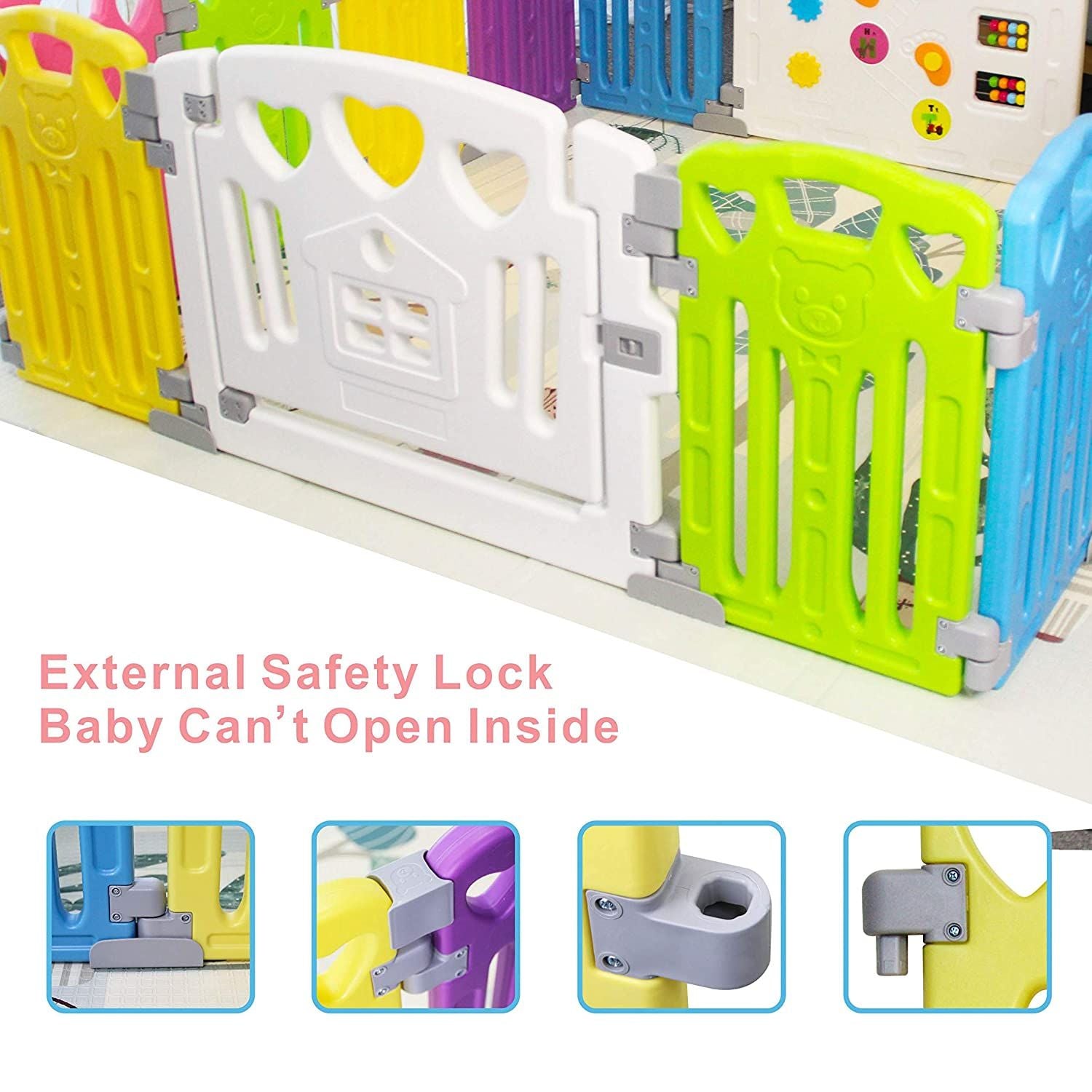 MOM'S LIFESAVER: Keep baby safe in there play activity centre when mom/dad needs to cook; clean up; go to the bathroom; etc.STURDY HOLDING: Specially designed anti-slip rubber feet underneath of the yard so the parts don't go sliding around.And We added the Anti-stick arm design in the picture to make the baby playpen more stableCOVERS A LARGE AREA: It is a great amount of play space for baby to learn walk and even laying with baby in it for play time. Total dimensions is 59x59x23.6inches.EASY TO ASSEMBLE: It is lightweight; easy to put together and take down; without 15 mins. Adding or removing extra panels is also very easySAY NO TO ANIMAL PEN: Bright and colorful design make the fence look more lovely in order to attract children and energize their mood automatically.
