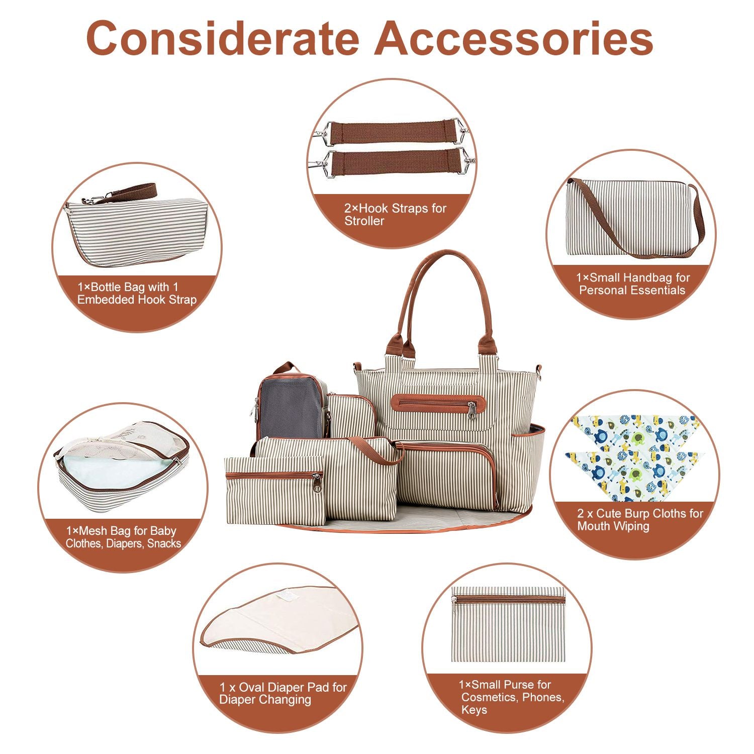 Considerate & Multiple Accessories: The included bottle bag, mesh bag, small handbag or purse is an easy storage for baby clothes, snacks, feeding bottles and personal necessities etc.. The oval Diaper Pad size is 25x15.4in, which is big enough for your baby lying. The 2Pcs burp cloths also provides help when baby burps.