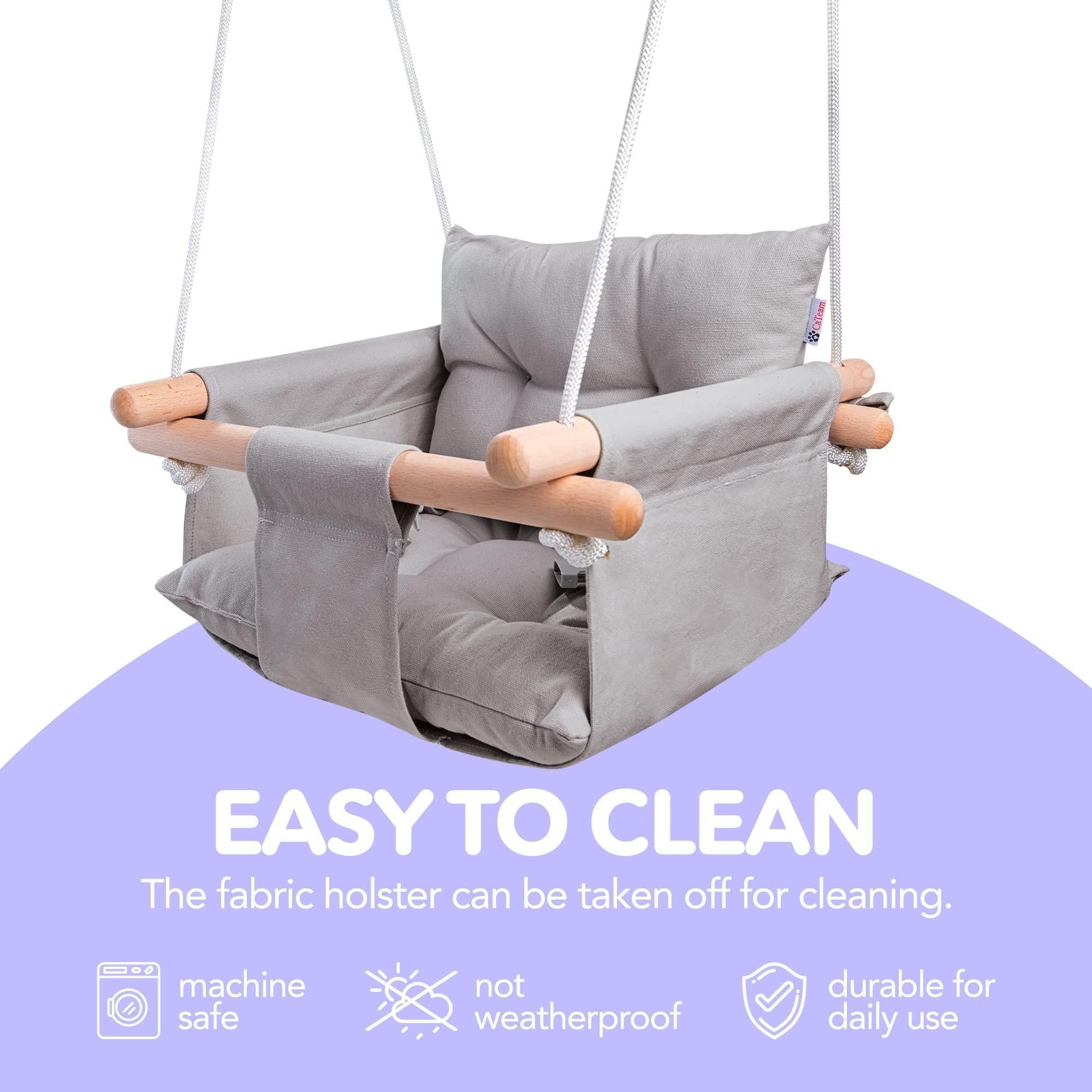 Made Extra Cozy - We use untreated and polished wooden dowels for our kids swings. The hanging chair features soft upholstery fabric and 2 pillows with skin-friendly polyester stuffing, which you can put together for extra comfort. Durable for Daily Use - Our hammock swings soft canvas is machine washable. This sturdy baby/toddler swing seat measures 16 x 16 inches (40 x 40 cm) with a capacity of 110 lbs (50 kgs). It also comes with heavy-duty installation hardware.